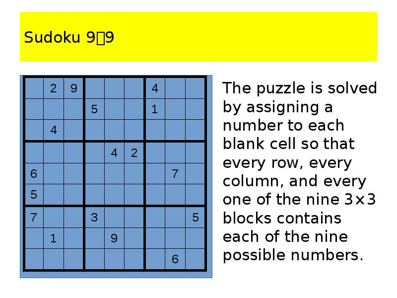 - 103. Sudoku 99 The puzzle is solved by assigning a number to