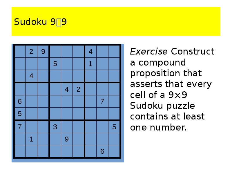 - 104. Sudoku 99 Exercise Construct a compound proposition that asserts that every