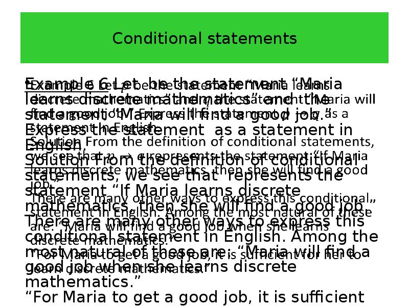 - 28. Conditional statements Example 6 Let be the statement “Maria learns discrete