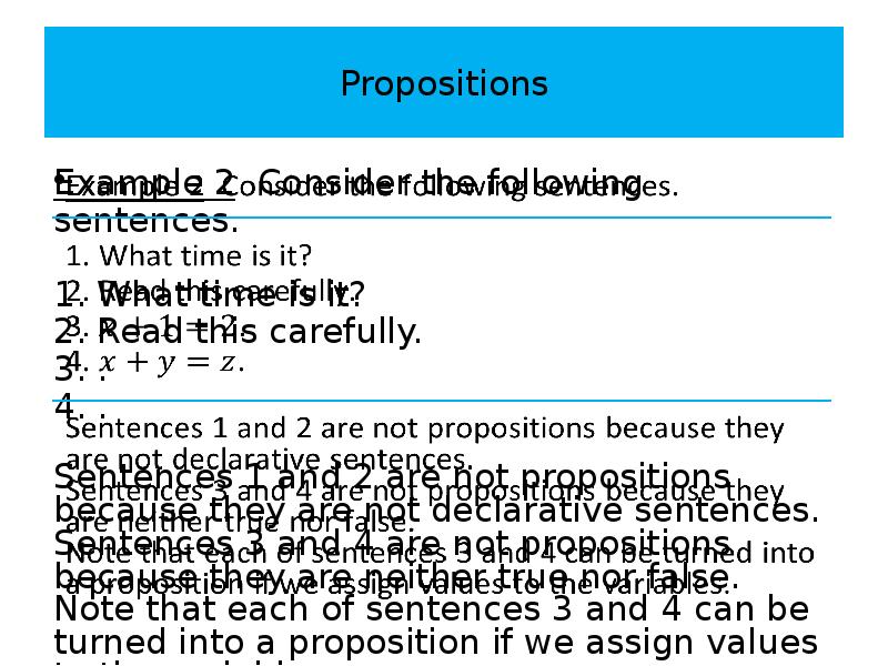 - 4. Propositions Example 2 Consider the following sentences. 1. What time is