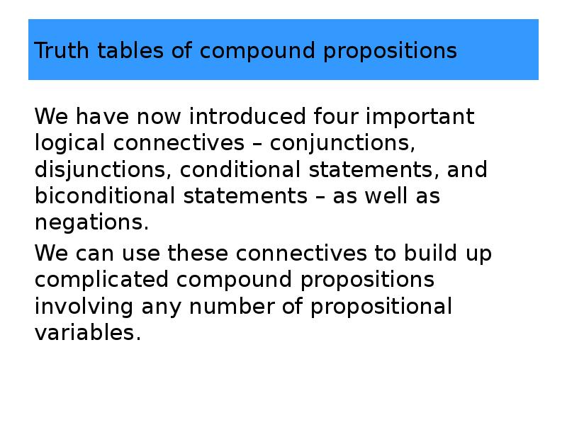 - 8. Compound propositions Many mathematical statements are constructed by combining one or
