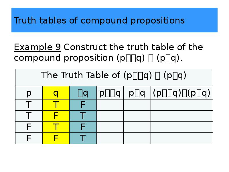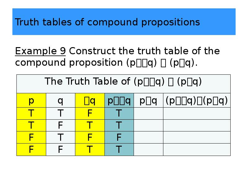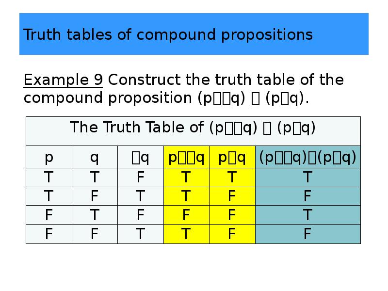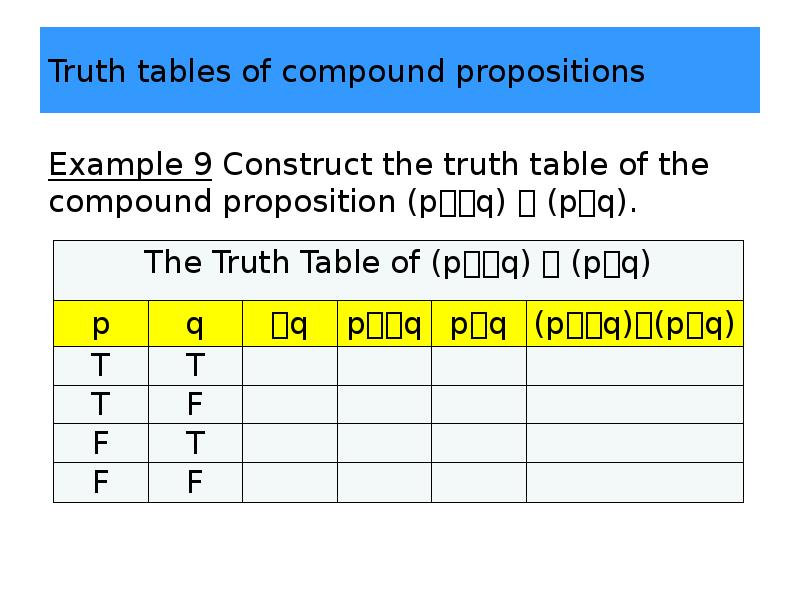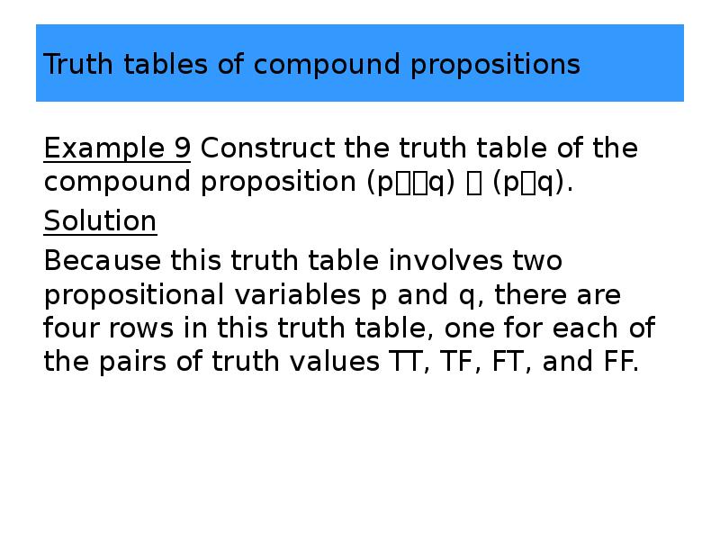 - 43. Truth tables of compound propositions Example 9 Construct the truth table