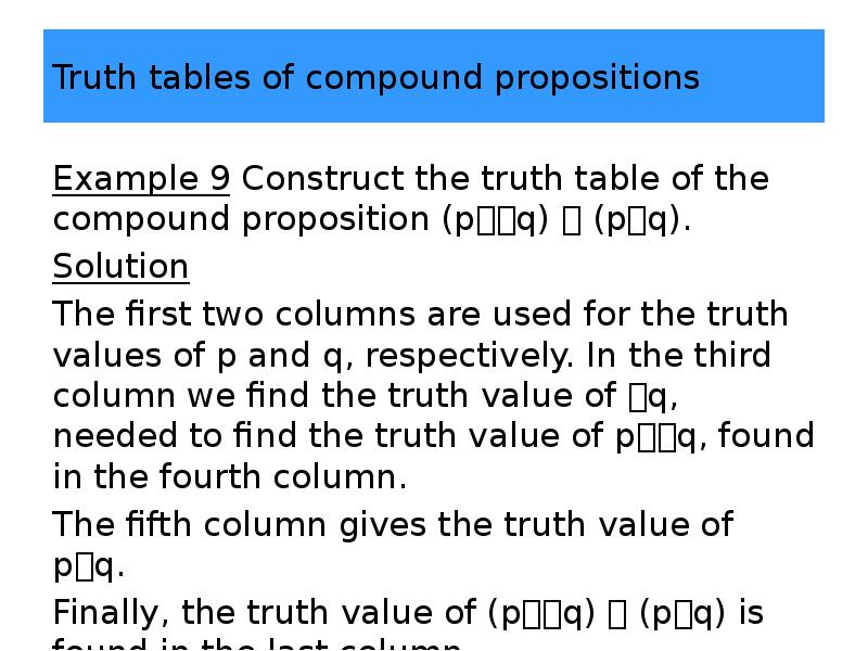 - 39. Truth tables of compound propositions Example 9 Construct the truth table