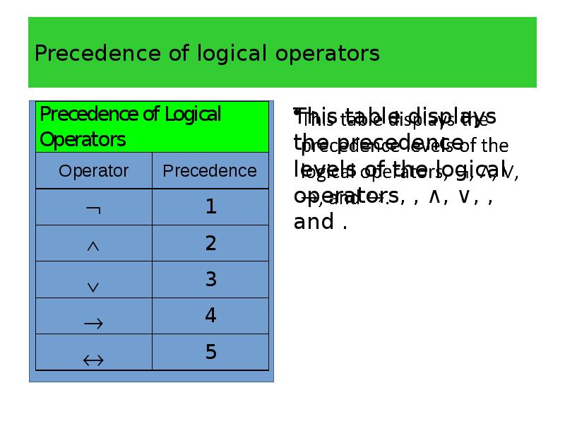 - 45. Precedence of logical operators This table displays the precedence levels of