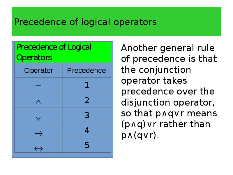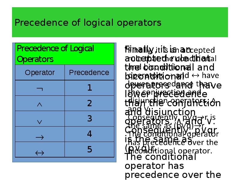 - 48. Precedence of logical operators Finally, it is an accepted rule that