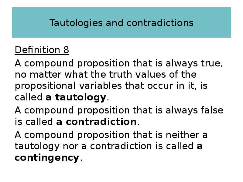 - 49. Tautologies and contradictions Definition 8 A compound proposition that is always