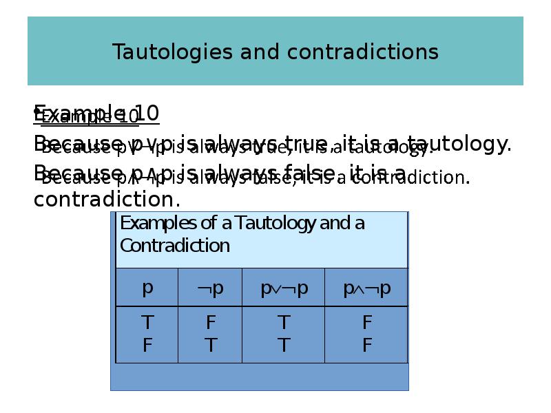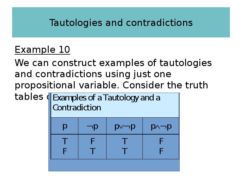 - 50. Tautologies and contradictions Example 10 We can construct examples of tautologies