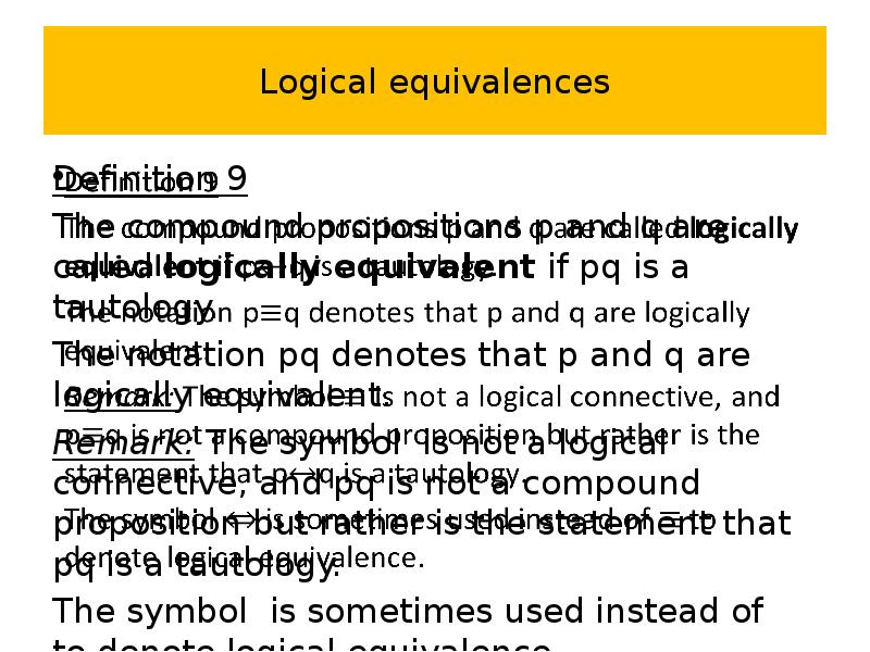 - 52. Logical equivalences Definition 9 The compound propositions p and q