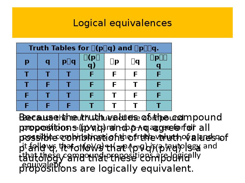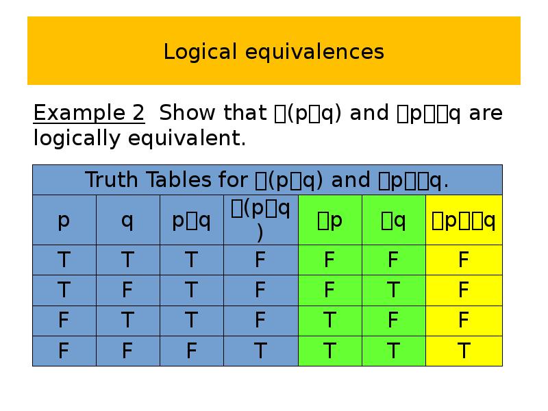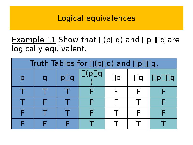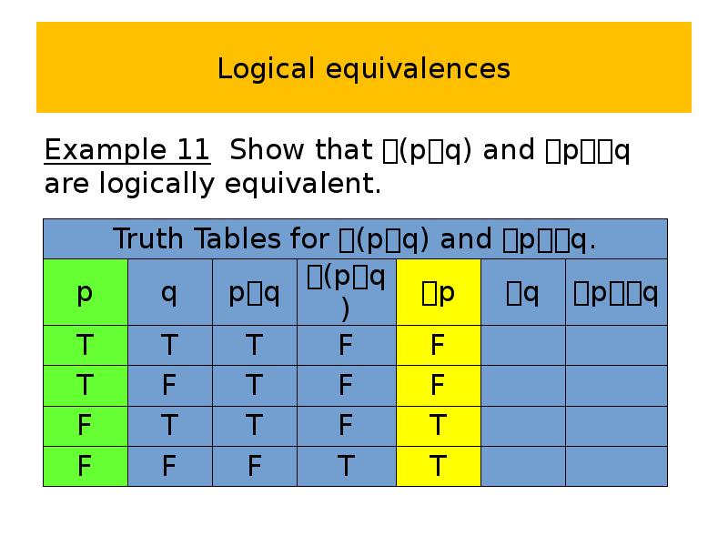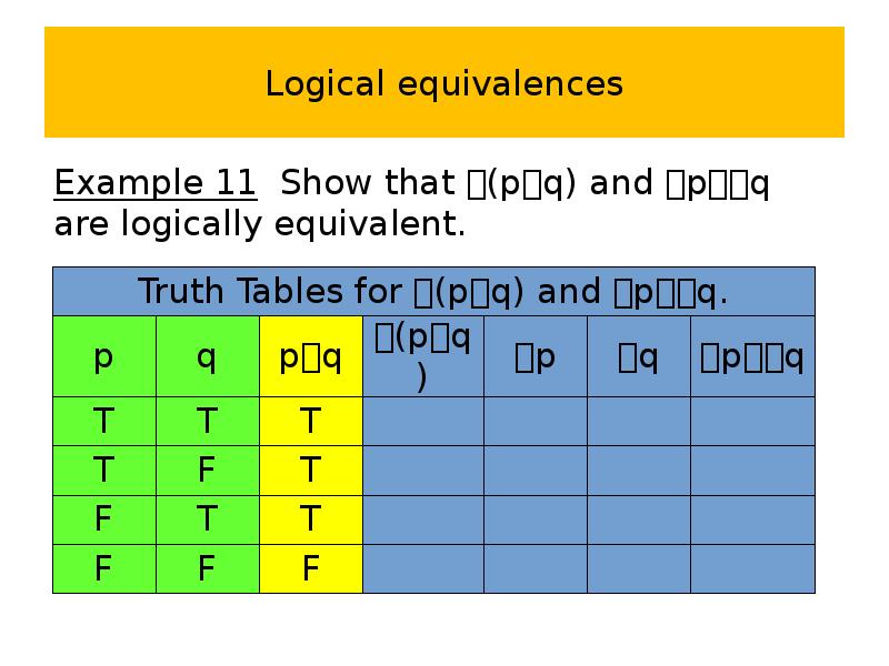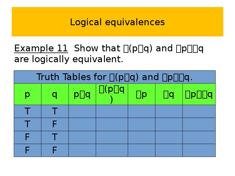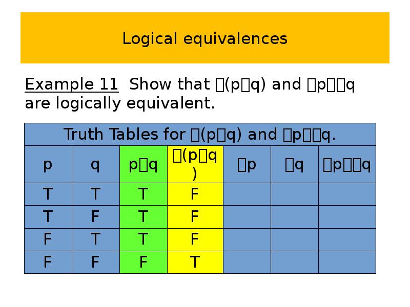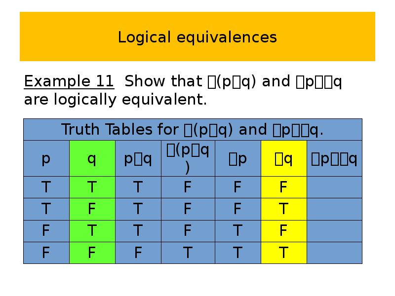 - 58. Logical equivalences Example 11 Show that (pq) and pq are logically