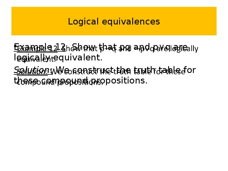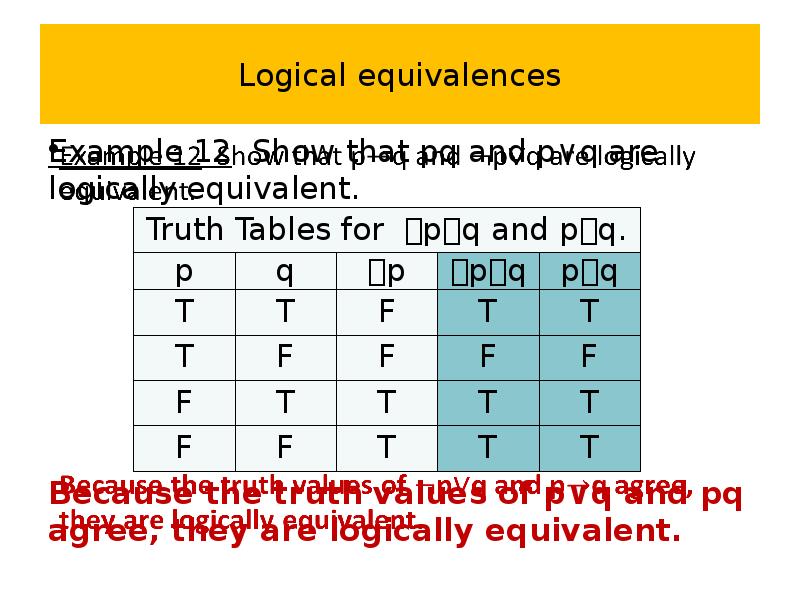 - 64. Logical equivalences Example 12 Show that pq and p∨q are logically