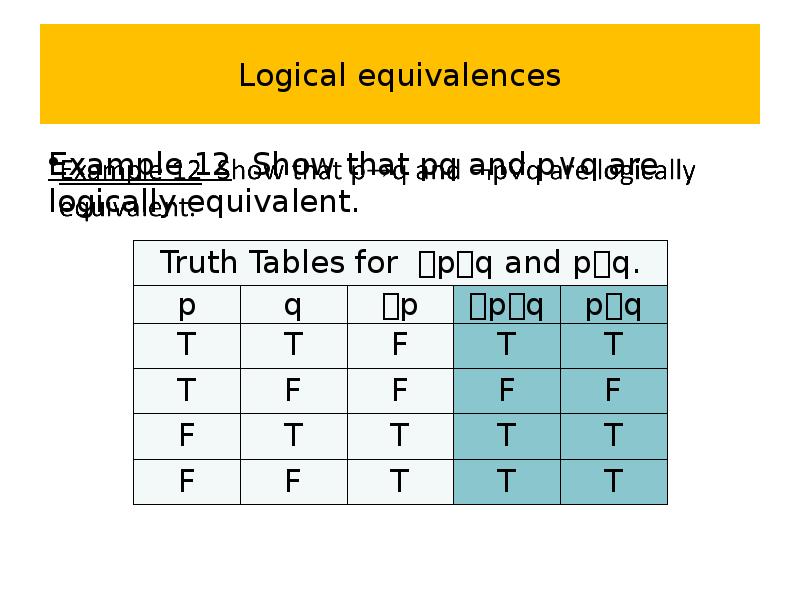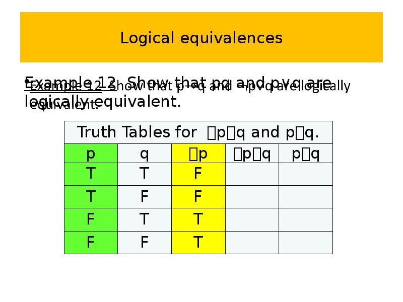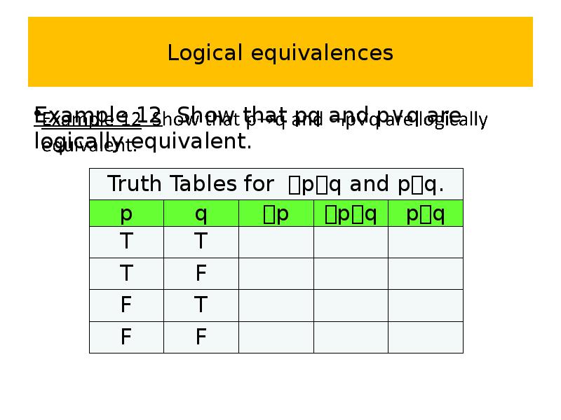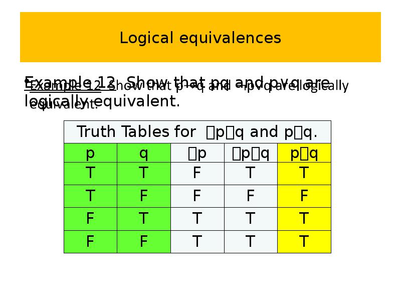 - 67. Logical equivalences Example 12 Show that pq and p∨q are logically