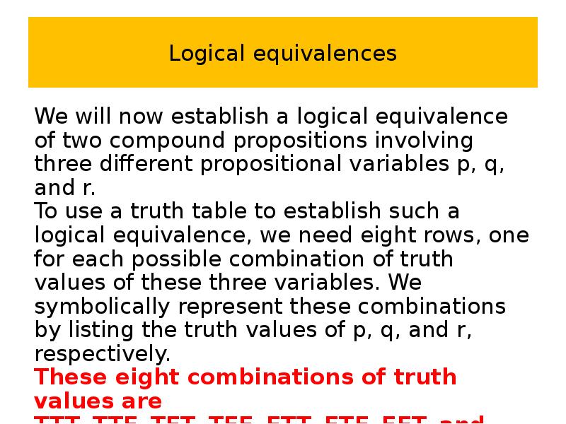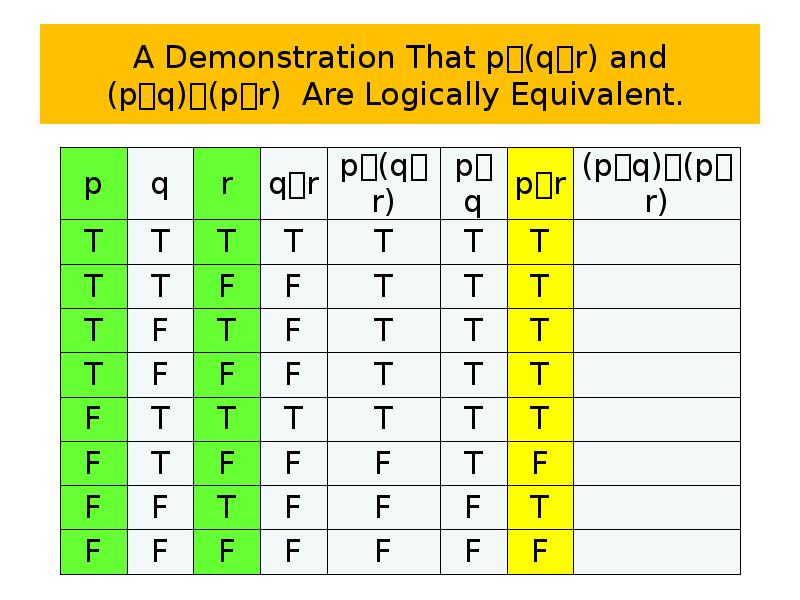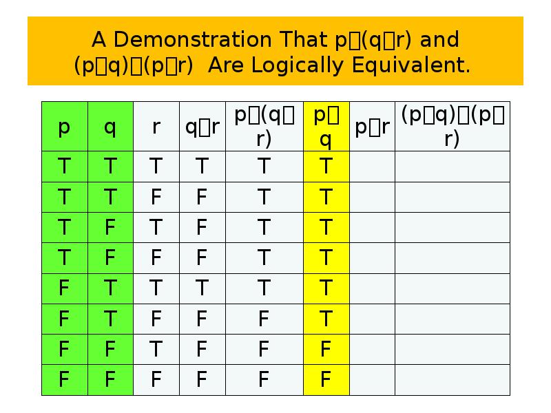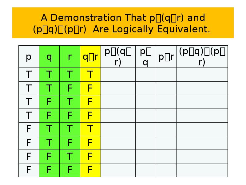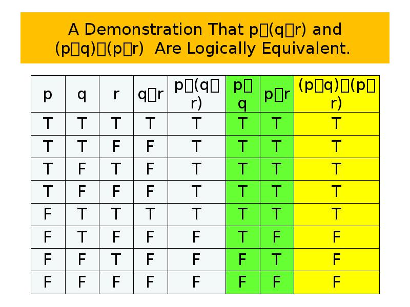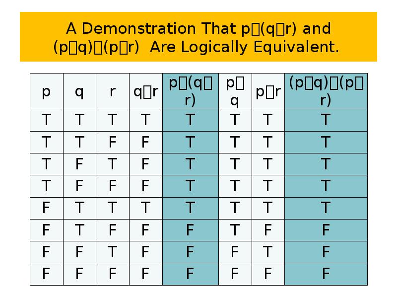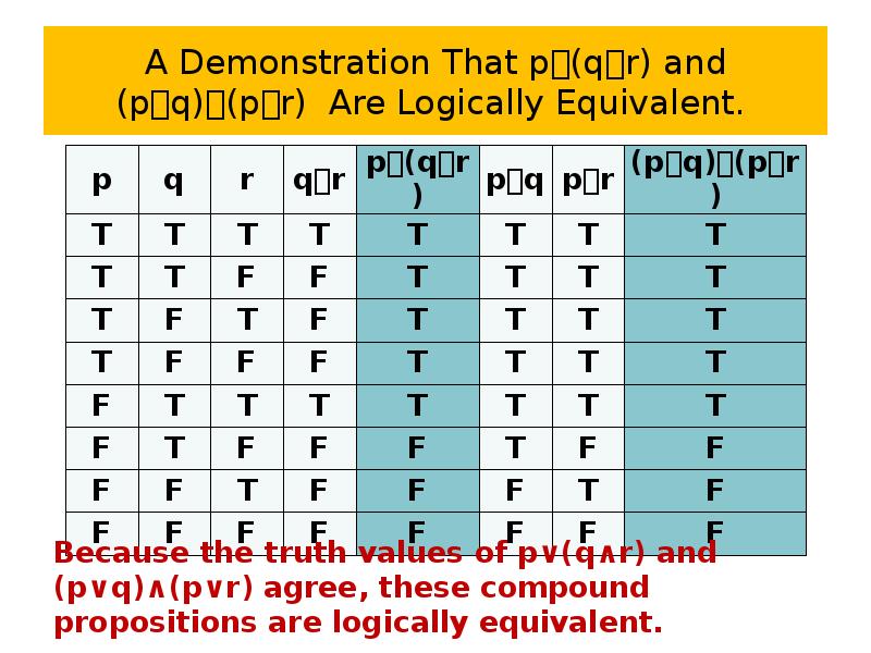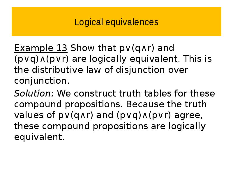 - 71. Logical equivalences Example 13 Show that p∨(q∧r) and (p∨q)∧(p∨r) are logically