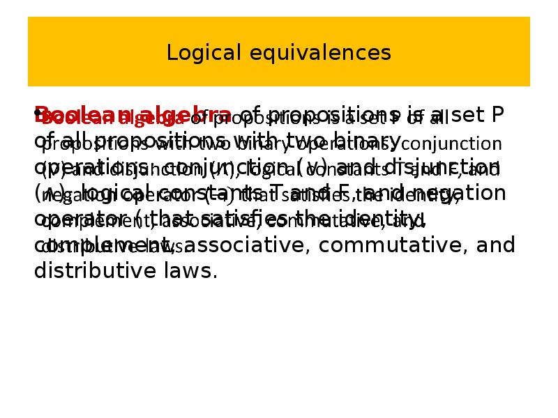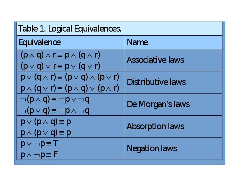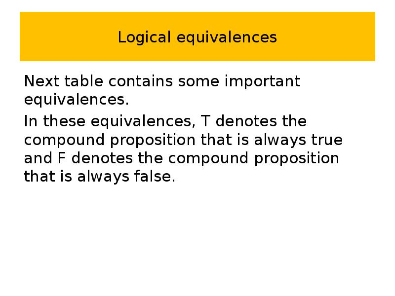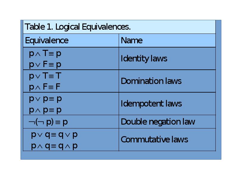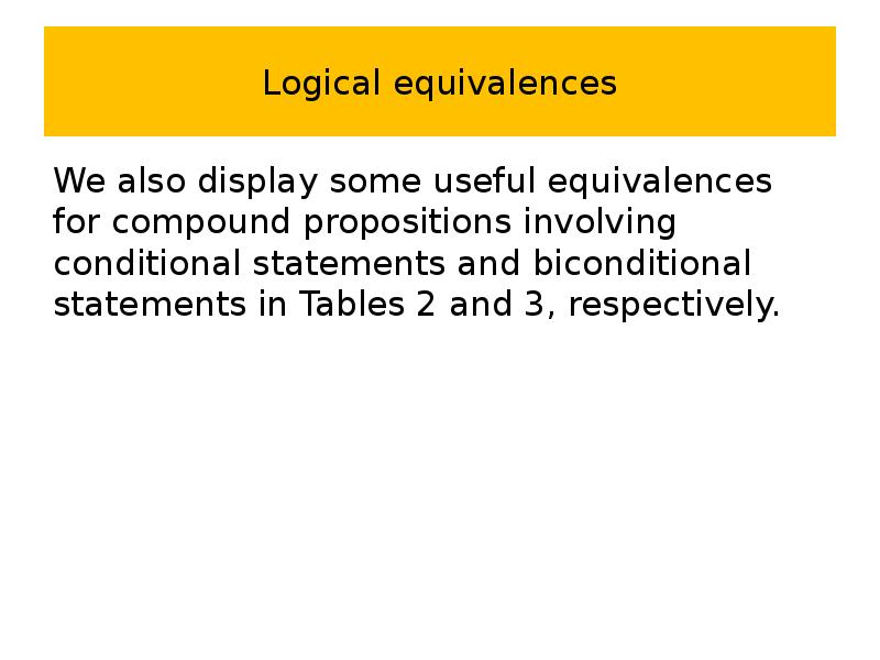 - 84. Logical equivalences We also display some useful equivalences for compound propositions