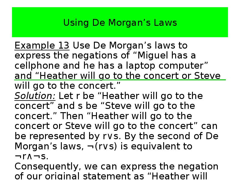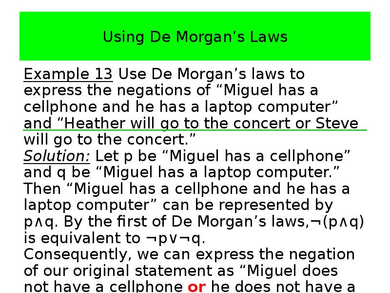 - 87. Using De Morgan’s Laws Example 13 Use De Morgan’s laws to