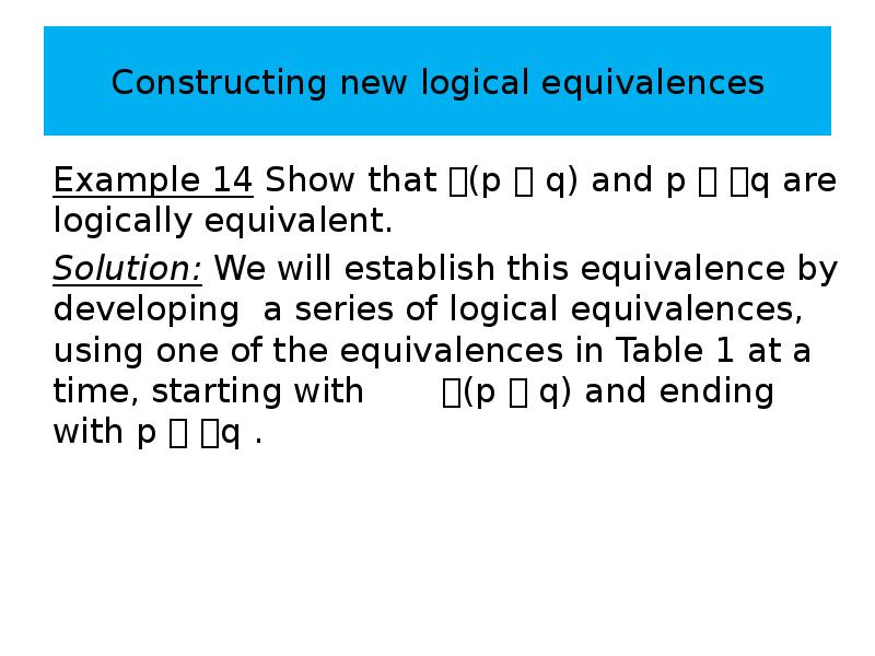 - 92. Constructing new logical equivalences Example 14 Show that (p q)