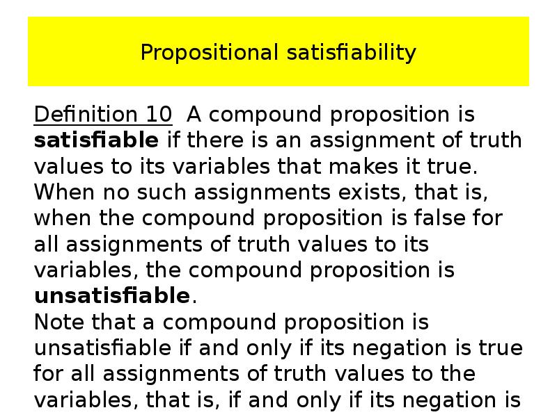 - 96. Propositional satisfiability Definition 10 A compound proposition is satisfiable if there