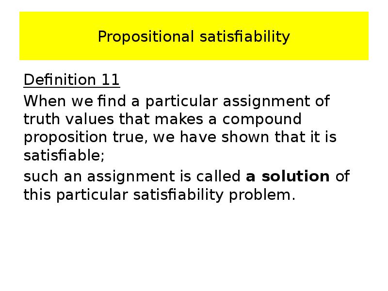 - 97. Propositional satisfiability Definition 11 When we find a particular assignment