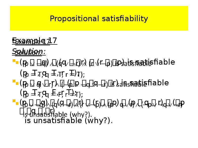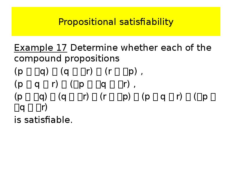 - 99. Propositional satisfiability Example 17 Determine whether each of the compound propositions