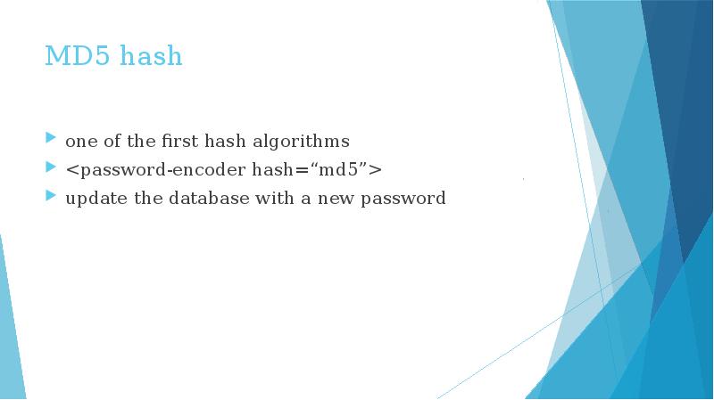 - 14. MD5 hash one of the first hash algorithms <password-encoder hash=“md5”> update