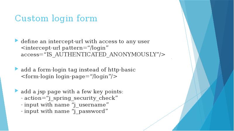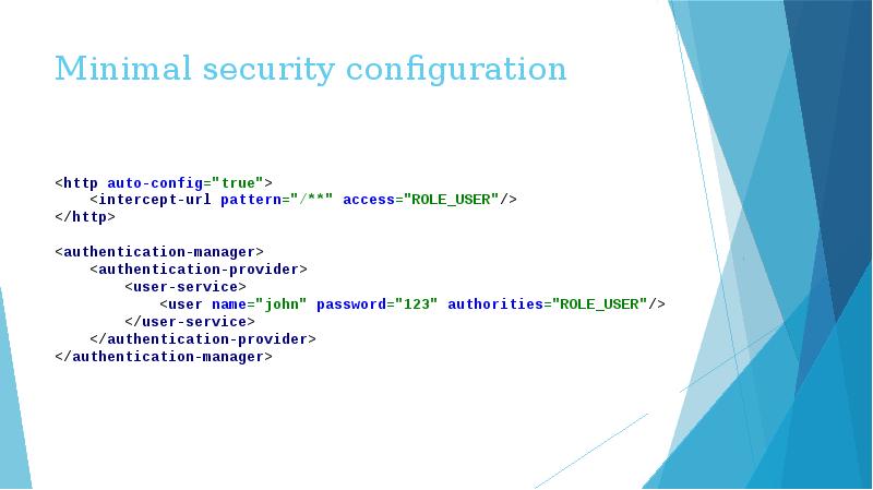 - 8. Minimal security configuration <http auto-config="true"> <intercept-url pattern="/**" access="ROLE_USER"/> </http> <authentication-manager>