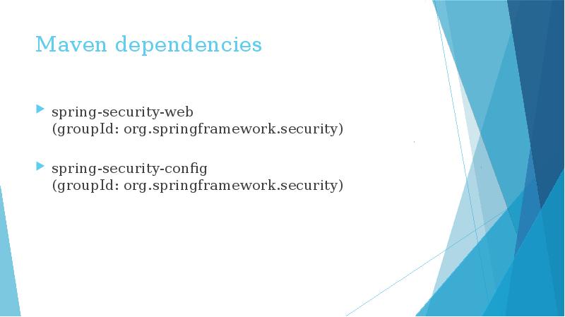 - 6. Maven dependencies spring-security-web (groupId: org.springframework.security) spring-security-config (groupId: org.springframework.security)