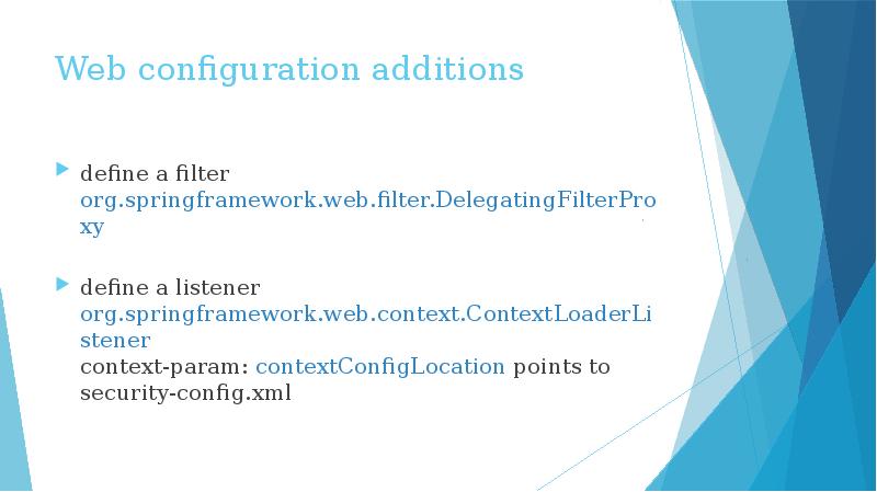 - 7. Web configuration additions define a filter org.springframework.web.filter.DelegatingFilterProxy define a listener