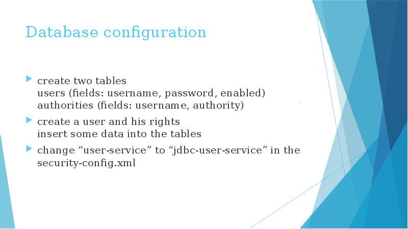 - 9. Database configuration create two tables users (fields: username, password, enabled) authorities