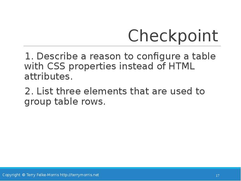 - 17. Checkpoint 1. Describe a reason to configure a table with CSS
