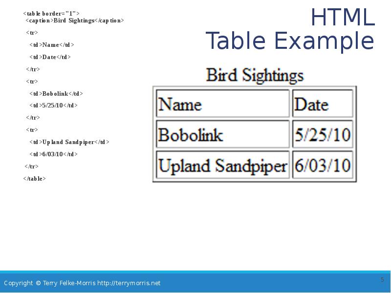 - 5. HTML Table Example <table border="1"> <caption>Bird Sightings</caption> <tr> <td>Name</td>