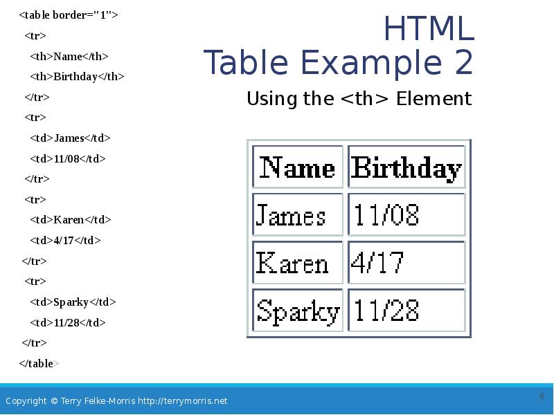 - 6. HTML Table Example 2 <table border="1"> <tr> <th>Name</th> <th>Birthday</th>