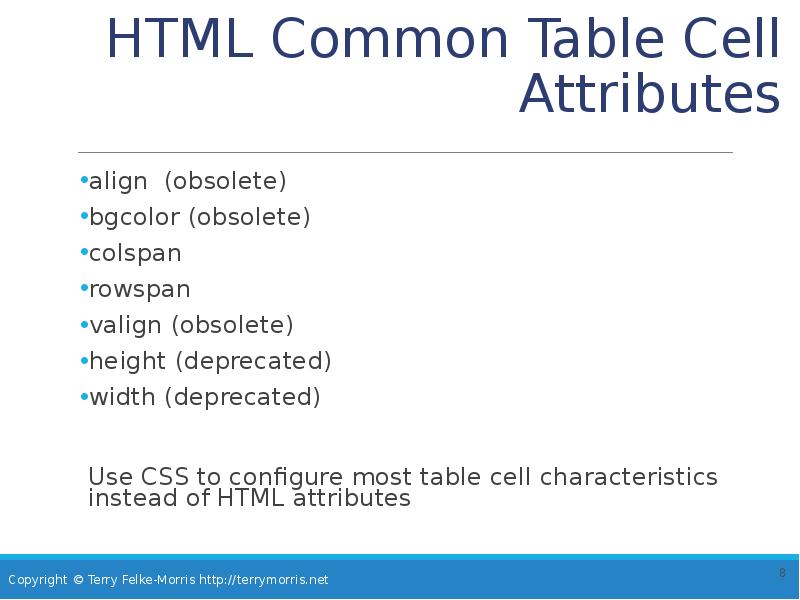 - 7. HTML Table Attributes align (obsolete) bgcolor (obsolete) border cellpadding (obsolete)