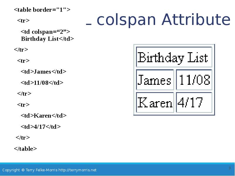 - 9. HTML colspan Attribute <table border="1"> <tr> <td colspan=“2”> Birthday List</td>
