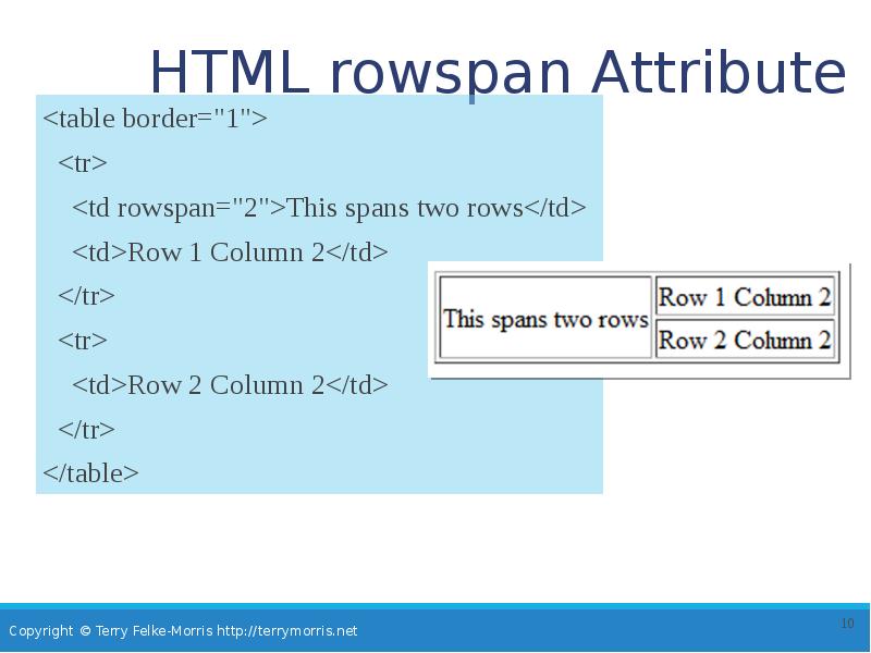 - 10. HTML rowspan Attribute <table border="1"> <tr> <td rowspan="2">This spans two