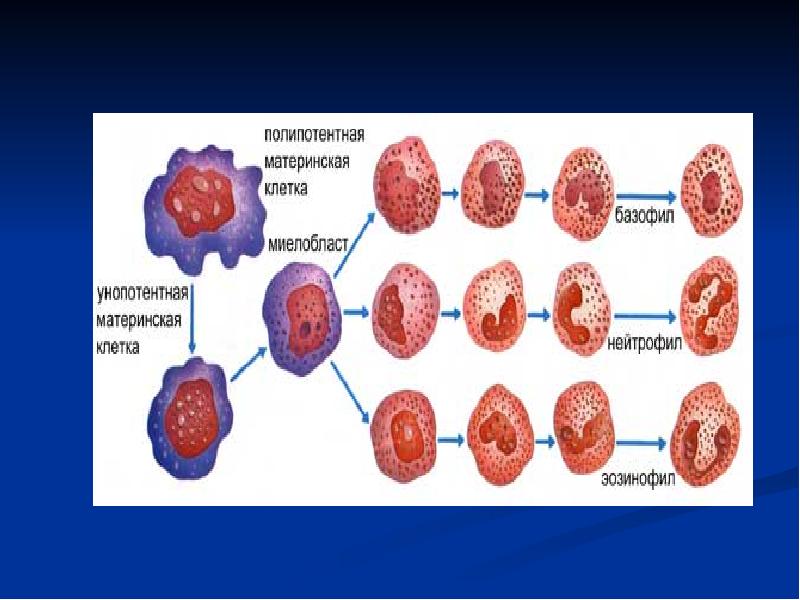 - 70. В периферической крови выявляются все переходные формы клеточных элементов: Промиелоциты Миелоциты