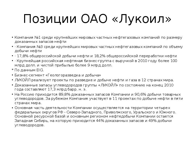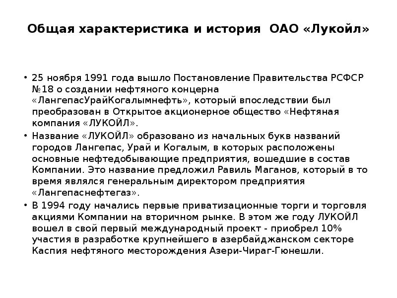 - 7. Общая характеристика и история ОАО «Лукойл» 25 ноября 1991 года