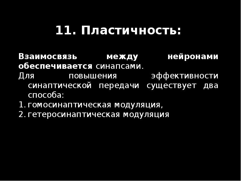 - 3. Гомосинаптическая модуляция На постсинаптической мембране возрастает концентрация рецепторов, поэтому повышается чувствительность