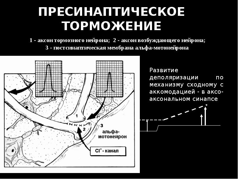 - 24. МЕХАНИЗМ ПРЕСИНАПТИЧЕСКОГО ТОРМОЖЕНИЯ Возникает в области аксо-аксональных синапсов, на пресинаптических терминалях.