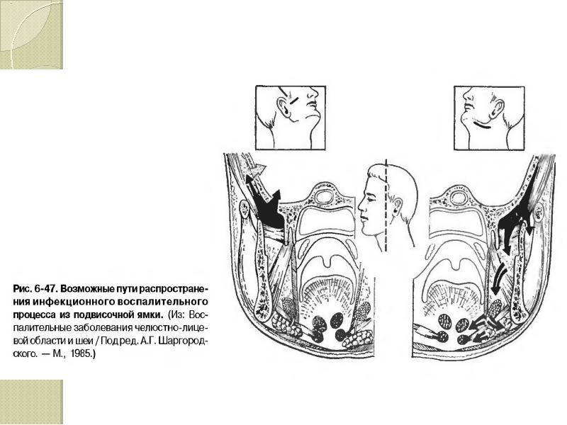 - 25. Пути дальнейшего распространения инфекции Окологлоточное пространство позадичелюстное пространство, Щечная