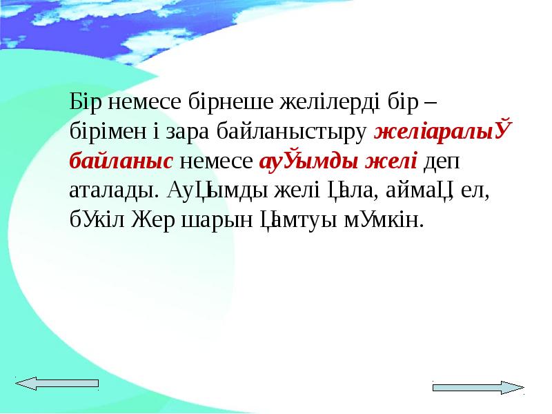 - 6. Жергілікті желі- бірнеше компьютерлерді біріктіру үшін қолданылады. Жергілікті желі