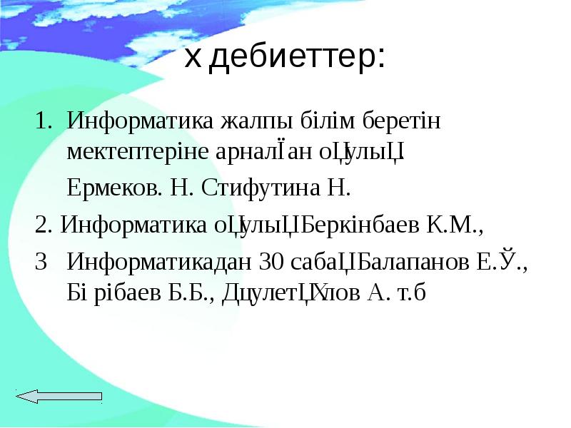- 22. Әдебиеттер: Информатика жалпы білім беретін мектептеріне арналған оқулық. Ермеков. Н.