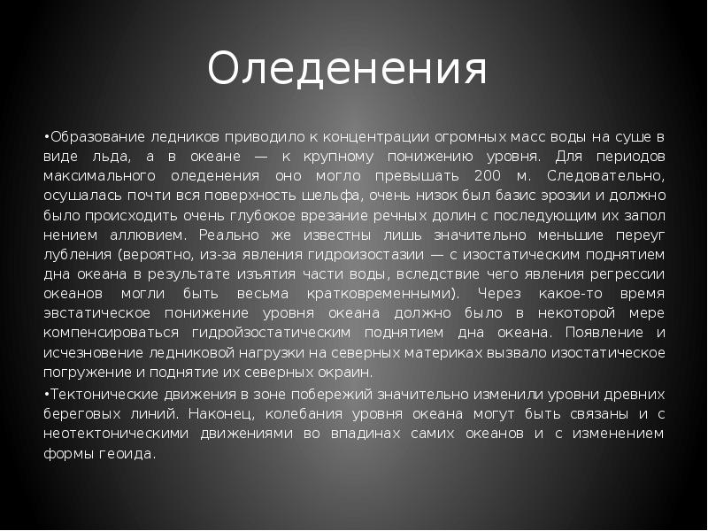 - 2. Оледенения Образование ледников приводило к концентрации огромных масс воды на