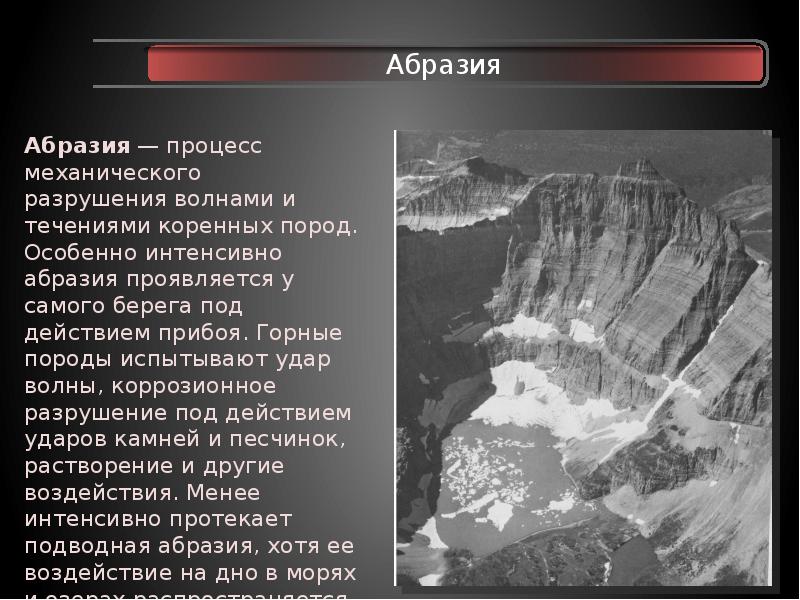 - 33. Абразия Абразия — процесс механического разрушения волнами и течениями коренных пород. Особенно интенсивно абразия