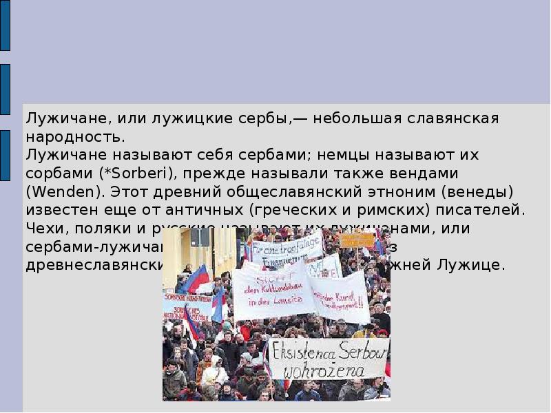 - 3. Лужицкие сербы — одно из четырех официально признанных национальных меньшинств Германии(наряду, фризами и датчанами). Лужицкие сербы —