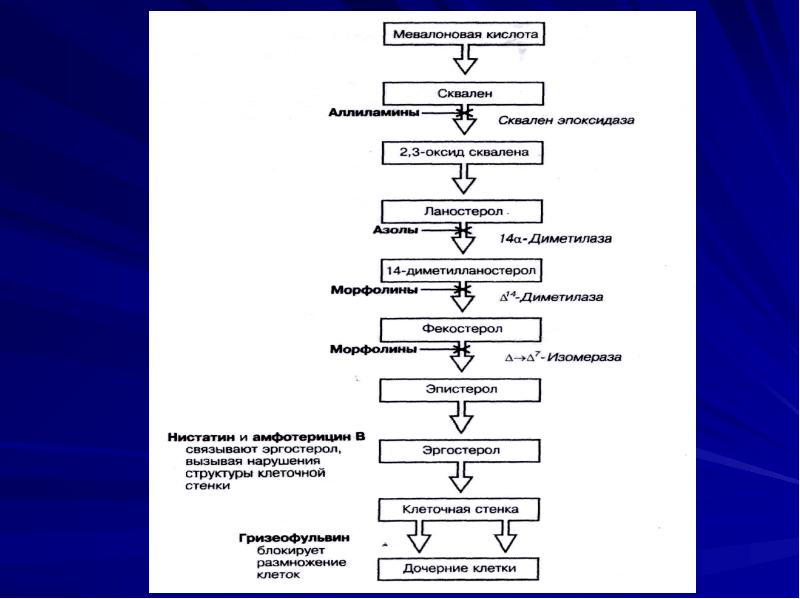 - 77. Антимикотики Азолы - нарушают синтез эргостерола (кетоконазол, миконазол, клотримазол, дифлюкан) Алиламины