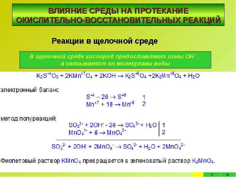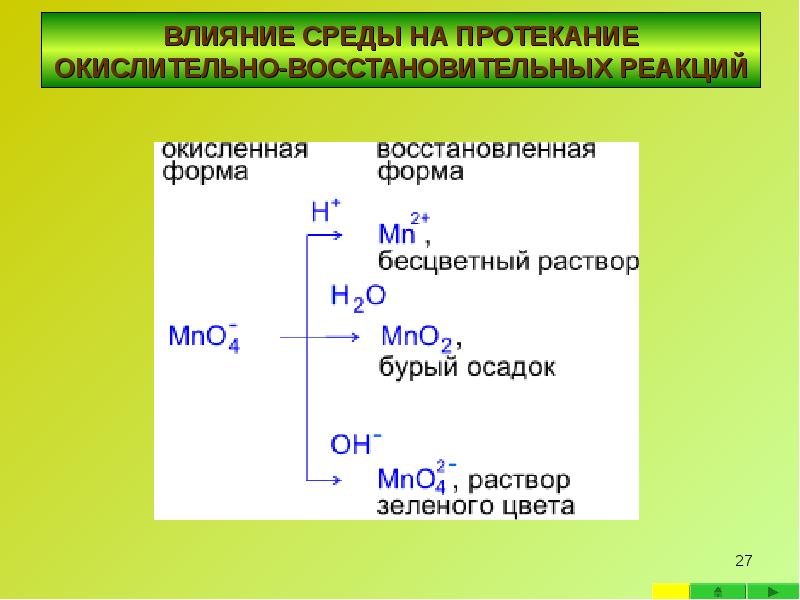 - 23. ВЛИЯНИЕ СРЕДЫ НА ПРОТЕКАНИЕ ОКИСЛИТЕЛЬНО-ВОССТАНОВИТЕЛЬНЫХ