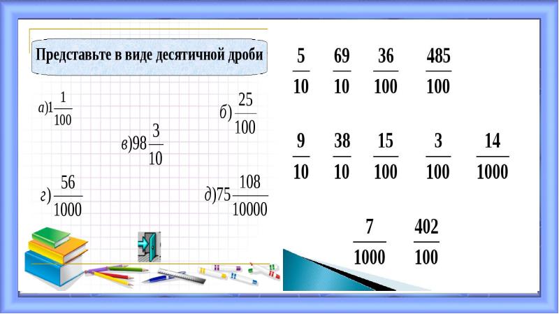 - 8. Понятие о десятичной дроби Обыкновенные дроби со знаменателями