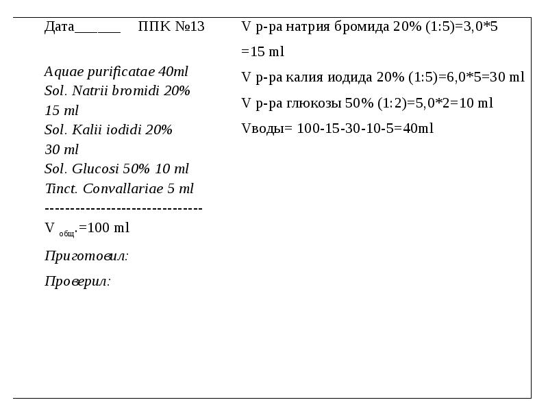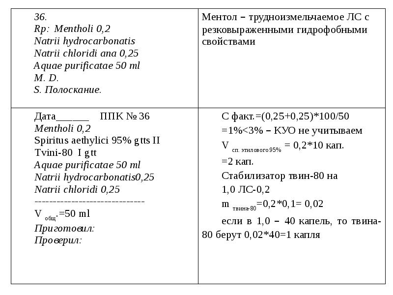 Контроль качества микстур Обязательные виды контроля: письменный – после изготовления микстуры оформляют лицевую сторону ППК: органолептический – соответствие цвета, запаха микстуры, цвету и запаху исходных компонентов, отсутствие механических частиц; контроль при отпуске – проверяют соответствие упаковки свойствам веществ, герметичность укупорки, правильность оформления этикетки; соответствие № рецепта, фамилии на рецепте и этикетке. Выборочные виды контроля: 1) физический. Микстуру переливают в цилиндр и определяют её объём, если объём микстуры не соответствует указанной в ППК, то проводят расчеты. Допустимые нормы отклонения в объёме свыше 50 мл до 150 мл составляет 3% (приказ МЗ РФ № 305). 2) опросный.