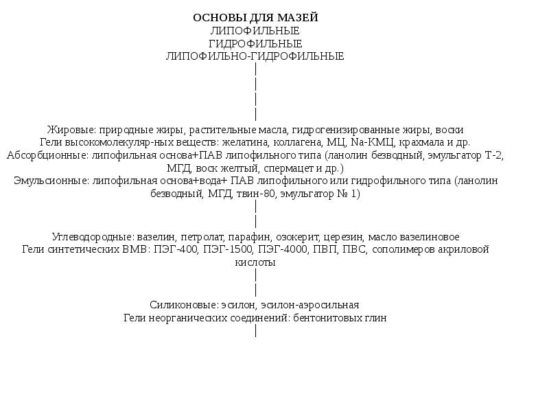 Эмульсионные мази По типу эмульсии в липофильные основы вводят водорастворимые ЛС: соли алкалоидов и других гетероциклических оснований (дикаин, новокаин, калия иодид, серебра нитрат, гексаметилентетрамин, этакридина лактат). Протаргол, колларгол, танин обязательно растворяют в воде образуются при введении водных растворов адреналина гидрохлорида, перекиси водорода, сока алоэ, глицерина, ихтиола, спирто-водно-глицериновых растворов экстрактов