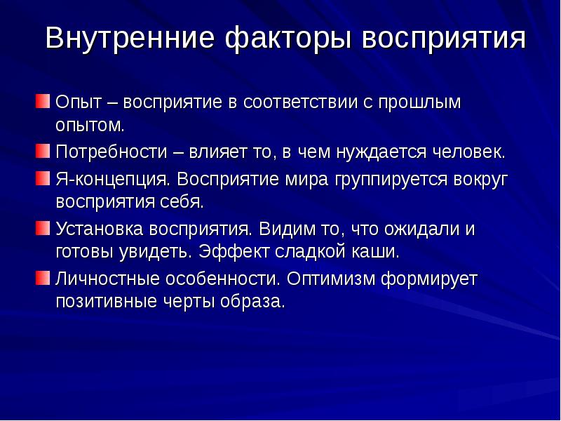 - 12. Внутренние факторы восприятия Опыт – восприятие в соответствии с прошлым опытом.
