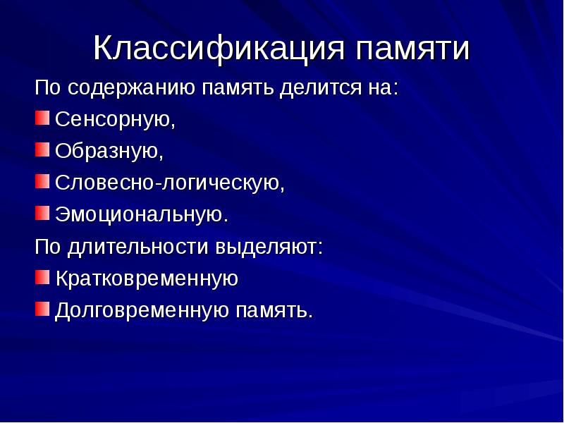 - 17. Классификация памяти По содержанию память делится на: Сенсорную, Образную, Словесно-логическую, Эмоциональную.